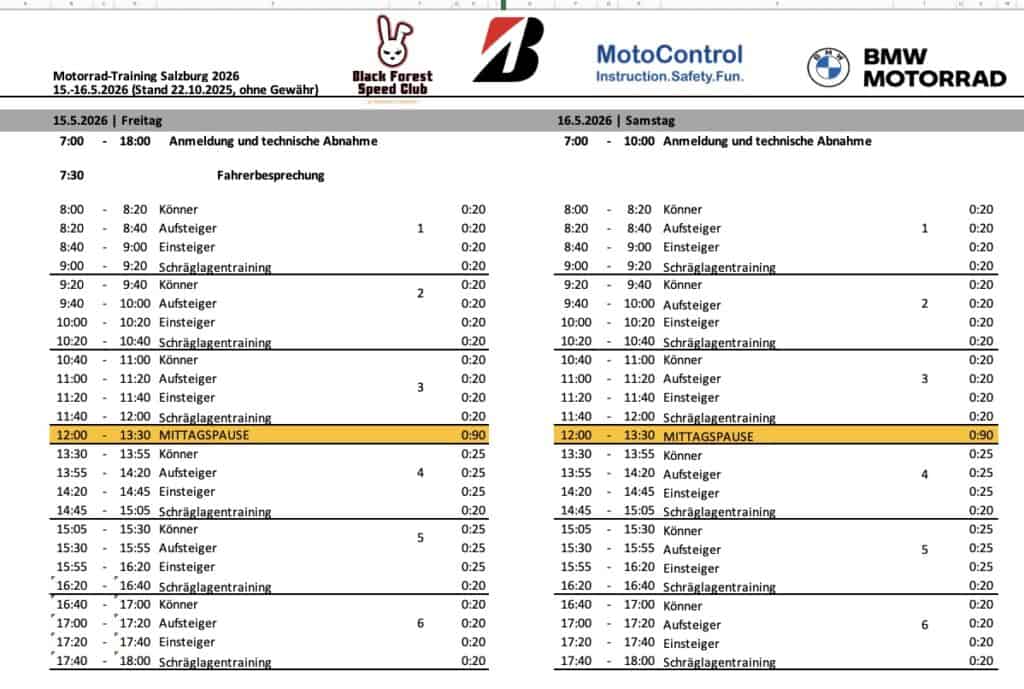 Zweitägiges Motorrad-Renntraining auf dem Salzburgring | Fahrgeräusch max. 98 dB(A) | Fahren in bis zu vier Zeitblöcken | bis zu 130 Minuten je Tag | Testmöglichkeit BMW-Modelle | Instruktion gegen Aufpreis | Reifendienst | ausdrücklich keine Zeitnahme! | Grillwurst & Feierabendbier inklusive | Streckenrundgang
